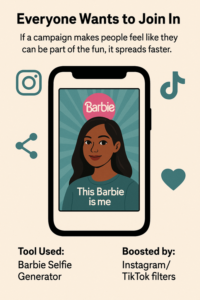 If a campaign makes people feel like they can be part of the fun, it spreads faster. Take the Barbie movie’s viral Selfie Generator. You could snap a pic and instantly get a Barbie-style poster of yourself. It was everywhere: Instagram, TikTok, even celebrities got in on it. And when people see others having fun, they want to join in too.